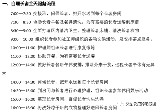 举例:天佑安康照料护理部作业指导书中“自理长者的全天服务流程”如下: