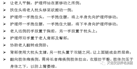 举例:天佑安康照料护理部作业指导书中卧床长者床上翻身操作步骤如下: