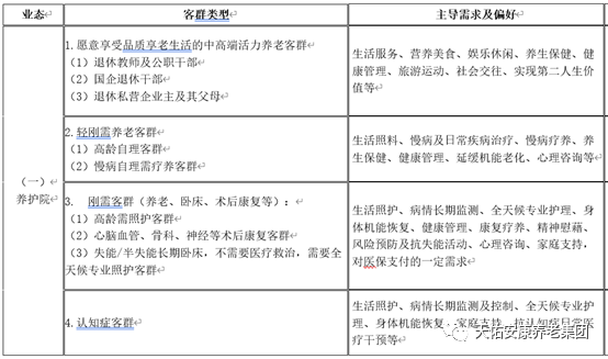 服务体系的搭建首先需要了解服务对象的需求。项目如果有很多业态,不同业态入住的客群的身份特征、身体状况、收入状况等的不同,需求也有不同,此外,还应结合项目地的地域特征,对入住客群的主导需求及偏好进行综合分析。如机构养老的业态中往往会入住活力客群、轻刚需、刚需以及认知症等不同类型客群,不同类型的需求状况大致如下: